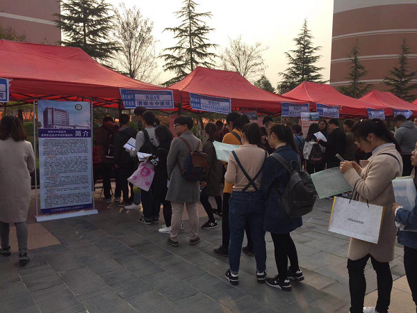 招聘会现场人头攒动,很多应聘的学生怀揣自荐信,寻找自己中意的单位和专业岗位,我院展位也被大量前来咨询的学生包围,场面异常火爆。在此期间,陕西中医药大学校长刘力教授来到我院的展位前,与人力资源科科长赵雅娜就2018年招聘计划和毕业生就业前景进行了深入的探讨和交流。