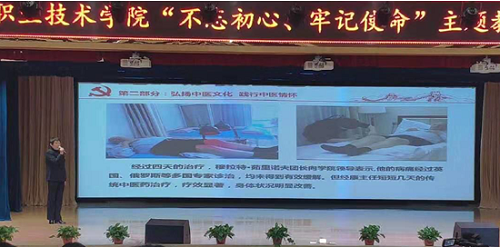 为进一步贯彻落实党的十九大精神和习近平新时代中国特色社会主义思想,扎实推进“不忘初心、牢记使命”主题教育,创新党课教育形式,增强党课的吸引力、感染力,引导全校党员讲好身边人身边事,凝聚发展正能量,12月11日下午,渭南职业技术学院在图书馆一楼报告厅举行了以“不忘初心、牢记使命”为主题的微党课比赛决赛。附属医院党总支机关支部书记王懿华同志代表附院参加本次比赛。